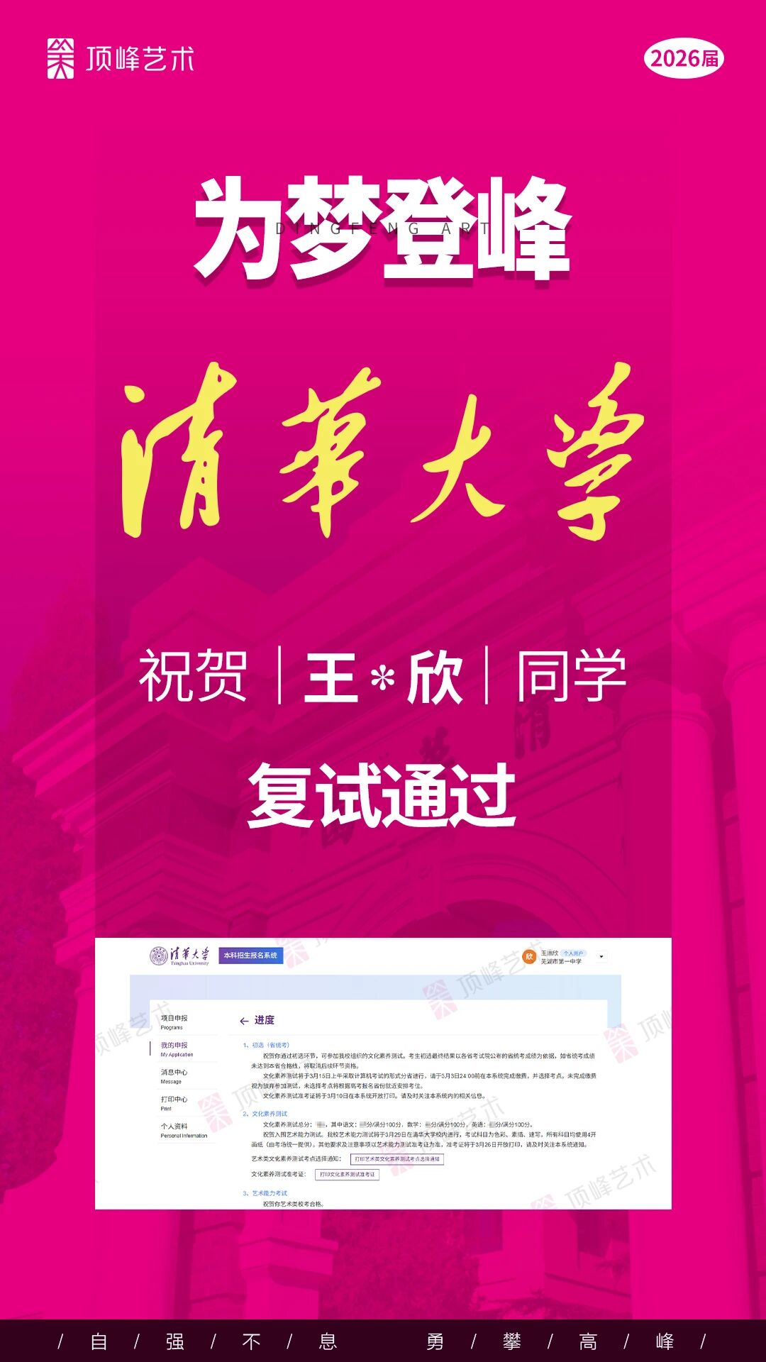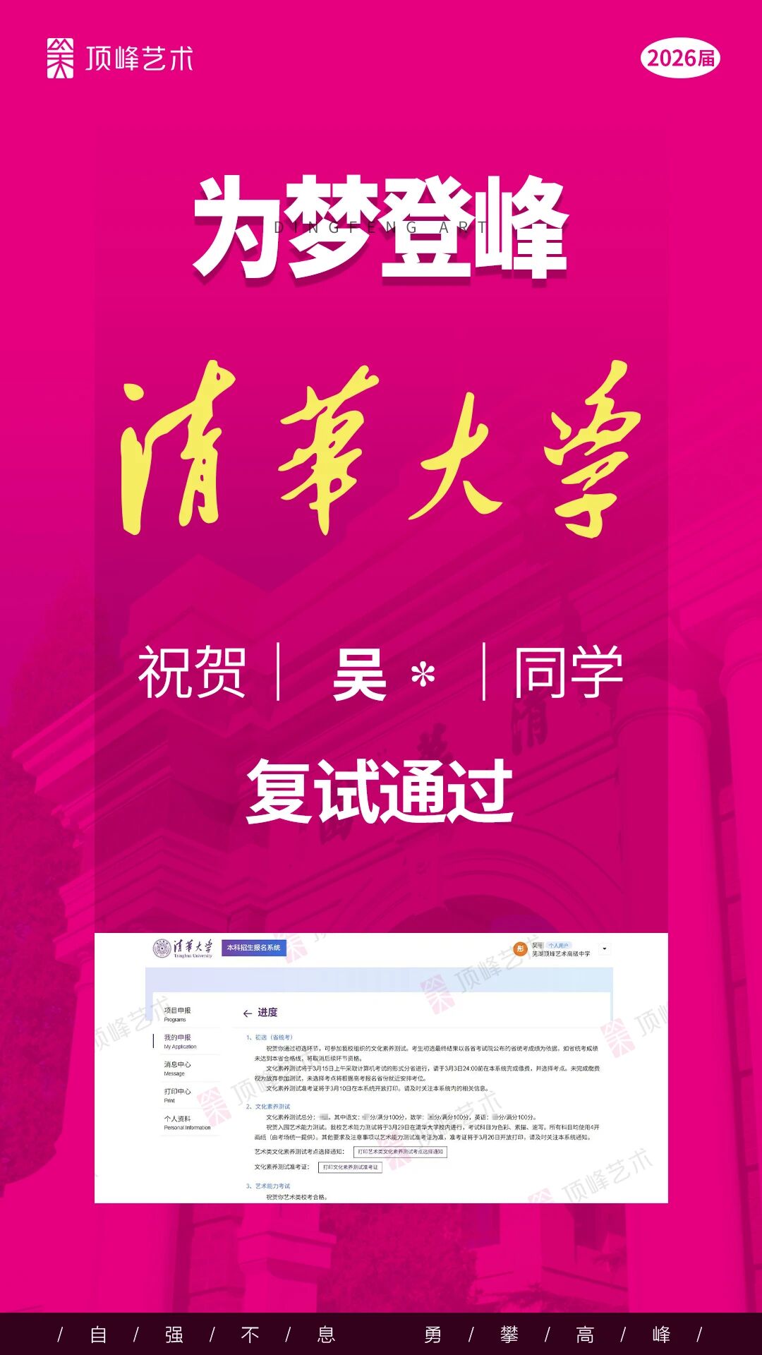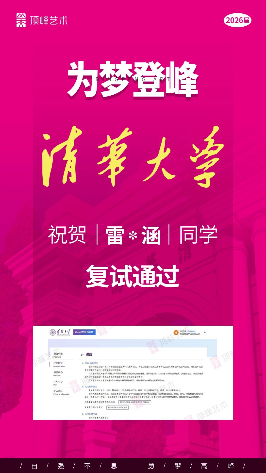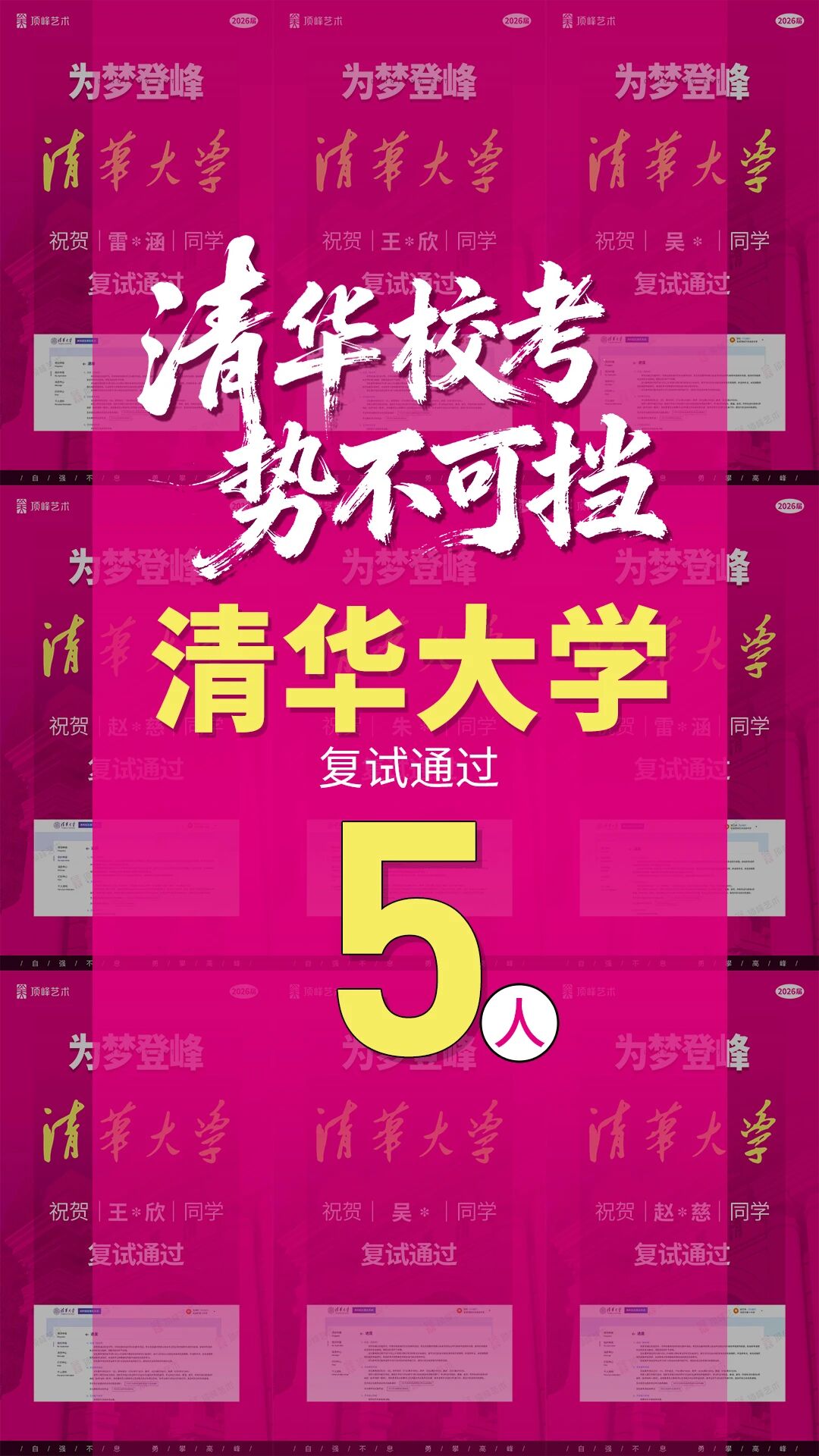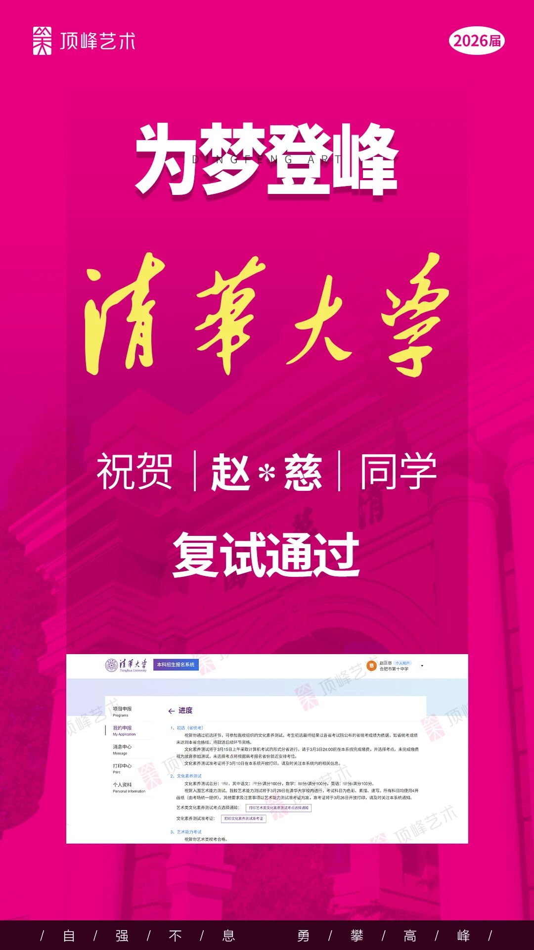 荣耀再续,实力见证!热烈祝贺顶峰学子斩获5张清华校考合格证! 每一张合格证,都凝结着少年们日夜不辍的坚持,是汗水与热爱的结晶,更是顶峰与学子并肩同行、共赴理想的最好见证。 2020—2025,连续六年,顶峰均有学子录取清华,累计达13人。 这份成绩,从来不是偶然,而是顶峰始终坚守的教育初心与全力以赴的保驾护航。 未来,从精准的备考策略到专业的师资团队,从个性化成长规划到全程暖心守护,顶峰将一如既往,以匠心回应每一份热爱,助力更多艺术学子奔赴理想院校!
